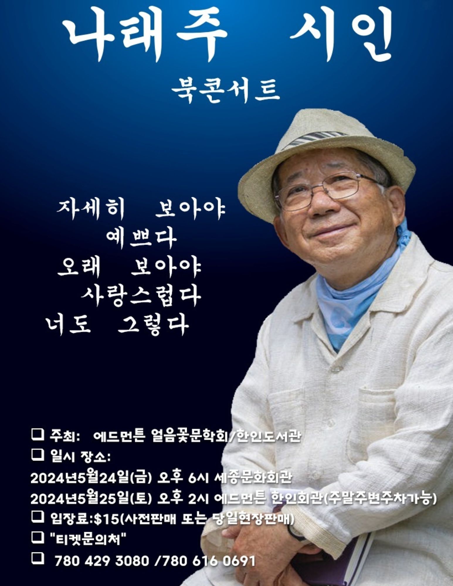 2024 나태주 시인 북콘서트 안내 작성자 정보 운영자 작성 작성일 2026.04.11 22:31 컨텐츠 정보 23 조회 목록 본문 SNS 공유 관련자료 링크 http://www.edmontonkorean.org/new/2024-%eb%82%98%ed%83%9c%ec%a3%bc-%ec%8b%9c%ec%9d%b8-%eb%b6%81%ec%bd%98%ec%84%9c%ed%8a%b8-%ec%95%88%eb%82%b4/ 9 회 연결 댓글 0 등록된 댓글이 없습니다. 로그인한 회원만 댓글 등록이 가능합니다. 목록