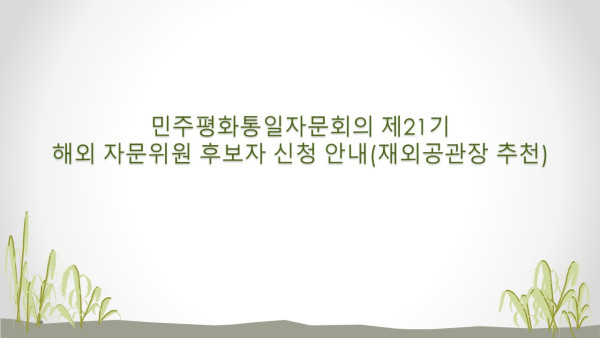 민주평화통일자문회의에서는 제20기 자문위원의 임기가 만료됨(2023.8.31.)에 따라 제21기 자문위원을 위촉할 예정입니다. 재외공관에서는 제21기 자문위원 후보자를 추천하고자 하오니, 추천을 받고자 하시는 많은 분들의 관심과 참여 바랍니다.