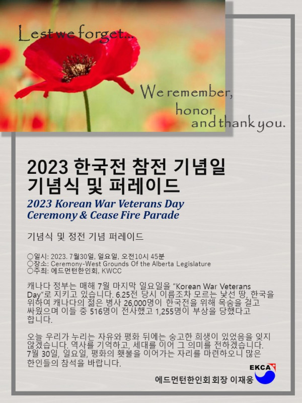 2023 한국전 참전 기념식 및 퍼레이드 행사 안내 작성자 정보 운영자 작성 작성일 2026.04.11 22:31 컨텐츠 정보 38 조회 목록 본문 SNS 공유 관련자료 링크 http://www.edmontonkorean.org/new/2023-%ed%95%9c%ea%b5%ad%ec%a0%84-%ec%b0%b8%ec%a0%84-%ea%b8%b0%eb%85%90%ec%8b%9d-%eb%b0%8f-%ed%8d%bc%eb%a0%88%ec%9d%b4%eb%93%9c-%ed%96%89%ec%82%ac-%ec%95%88%eb%82%b4/ 14 회 연결 댓글 0 등록된 댓글이 없습니다. 로그인한 회원만 댓글 등록이 가능합니다. 목록