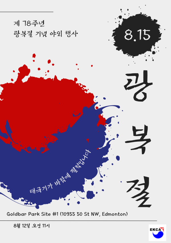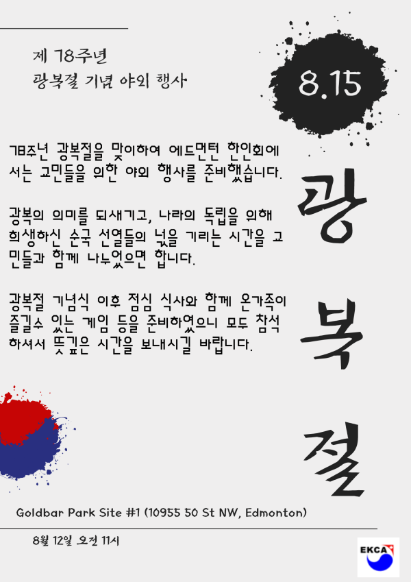 8월 12일 광복절 기념식 및 교민의날 행사 안내 작성자 정보 운영자 작성 작성일 2026.04.11 22:31 컨텐츠 정보 37 조회 목록 본문 SNS 공유 관련자료 링크 http://www.edmontonkorean.org/new/8%ec%9b%94-12%ec%9d%bc-%ea%b4%91%eb%b3%b5%ec%a0%88-%ea%b8%b0%eb%85%90-%ec%95%bc%ec%99%b8-%ed%96%89%ec%82%ac-%ec%95%88%eb%82%b4/ 18 회 연결 댓글 0 등록된 댓글이 없습니다. 로그인한 회원만 댓글 등록이 가능합니다. 목록