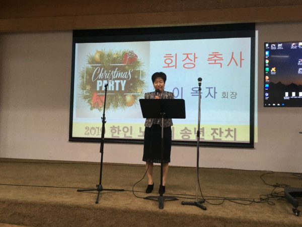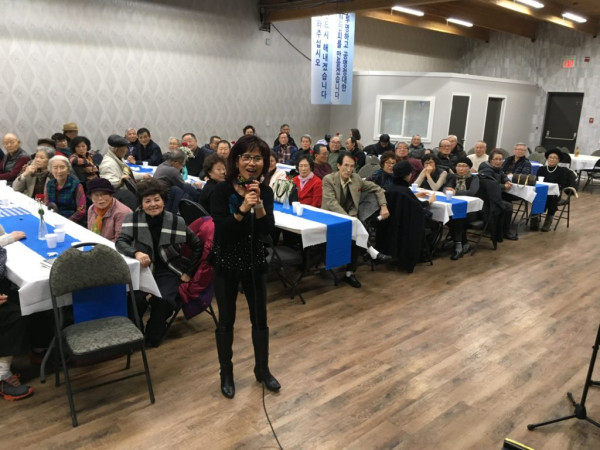 에드먼턴 한인 노인회(회장 이옥자)에서는 지난 12월 7일 다운타운 한인회관 대강당에서 2019년 송년잔치를 개최했다. 행사 당일 이른 아침부터 내린 눈으로 참여도에 문제가 생기는 것 아닌가 하는 조바심을 재우듯 130명이 넘는 회원들의 열화같은 참여에 행사장 준비좌석은 남김없이 채워졌다. 가평전투 참전약장(사진 파란색 장방형 배너) 를 패용한 Lyle Mcivor 씨를 비롯한 다수의 KVA(Korea War Veterans Association) 회원들도 참석해 자리를 빛내 주었다.