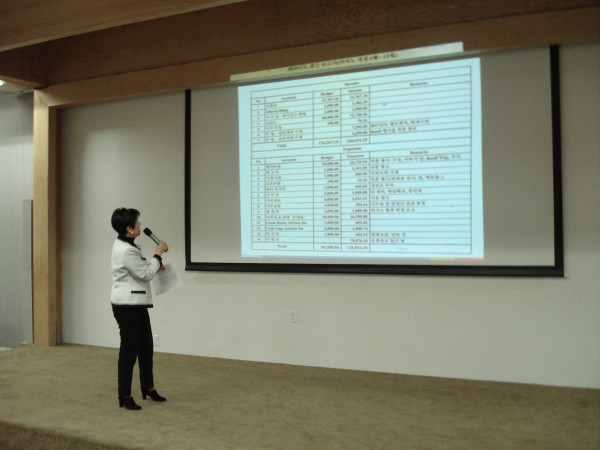 2018년도 감사보고를 한 유승길 감사는 집행부의 완벽한 행정및 회계처리를 칭찬하는 이변을 선보였다. 결산 자료 보고를 담당한 전옥자 회장은 보고전 카지노 계정과 일반계정으로 나누어 정리된 결산 보고서를 복사, 회원들에게 배포하고 대형 스크린에는 결산보고서를 올려 차분하게 보고를 이어갔다. 김중현 회원의 자산과 부채가 계정항목별로 상세정리된 대차대조표의 작성및 배부를 요청한 질문을 끝으로 질문시간을 마친 2018년도 회계보고 인준은 회원들의 만장일치에 가까운 찬성으로 통과되었다.