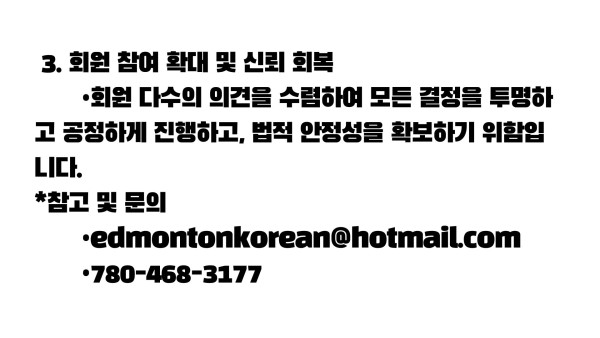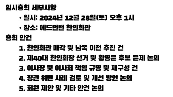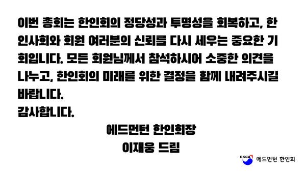2024년 12월 28일 에드먼턴 한인회 임시총회 개최 작성자 정보 운영자 작성 작성일 2026.04.11 22:31 컨텐츠 정보 44 조회 목록 본문 SNS 공유 관련자료 링크 http://www.edmontonkorean.org/new/2024%eb%85%84-12%ec%9b%94-28%ec%9d%bc-%ec%97%90%eb%93%9c%eb%a8%bc%ed%84%b4-%ed%95%9c%ec%9d%b8%ed%9a%8c-%ec%9e%84%ec%8b%9c%ec%b4%9d%ed%9a%8c-%ea%b0%9c%ec%b5%9c/ 16 회 연결 댓글 0 등록된 댓글이 없습니다. 로그인한 회원만 댓글 등록이 가능합니다. 목록