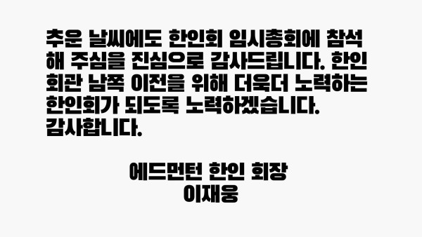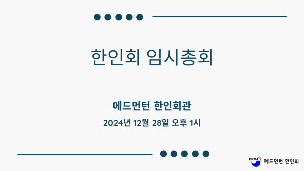한인회 임시총회 (2024년 12월 28일 오후 1시) 작성자 정보 운영자 작성 작성일 2026.04.11 22:31 컨텐츠 정보 46 조회 목록 본문 SNS 공유 관련자료 링크 http://www.edmontonkorean.org/new/%ed%95%9c%ec%9d%b8%ed%9a%8c-%ec%9e%84%ec%8b%9c%ec%b4%9d%ed%9a%8c-2024%eb%85%84-12%ec%9b%94-28%ec%9d%bc-%ec%98%a4%ed%9b%84-1%ec%8b%9c/ 14 회 연결 댓글 0 등록된 댓글이 없습니다. 로그인한 회원만 댓글 등록이 가능합니다. 목록