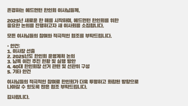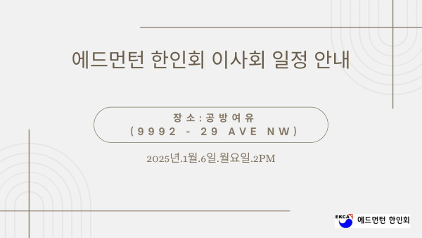2025.1.6. 한인회 이사회 일정 안내 작성자 정보 운영자 작성 작성일 2026.04.11 22:31 컨텐츠 정보 51 조회 목록 본문 SNS 공유 관련자료 링크 http://www.edmontonkorean.org/new/2025-1-6-%ed%95%9c%ec%9d%b8%ed%9a%8c-%ec%9d%b4%ec%82%ac%ed%9a%8c-%ec%9d%bc%ec%a0%95-%ec%95%88%eb%82%b4/ 15 회 연결 댓글 0 등록된 댓글이 없습니다. 로그인한 회원만 댓글 등록이 가능합니다. 목록