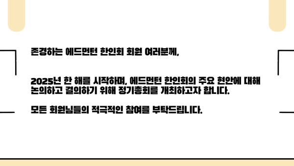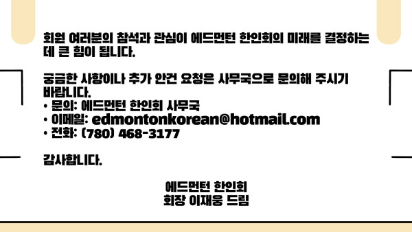 2025 에드먼턴 한인회 정기총회 공고 작성자 정보 운영자 작성 작성일 2026.04.11 22:31 컨텐츠 정보 54 조회 목록 본문 SNS 공유 관련자료 링크 http://www.edmontonkorean.org/new/2025-%ec%97%90%eb%93%9c%eb%a8%bc%ed%84%b4-%ed%95%9c%ec%9d%b8%ed%9a%8c-%ec%a0%95%ea%b8%b0%ec%b4%9d%ed%9a%8c-%ea%b3%b5%ea%b3%a0/ 15 회 연결 댓글 0 등록된 댓글이 없습니다. 로그인한 회원만 댓글 등록이 가능합니다. 목록