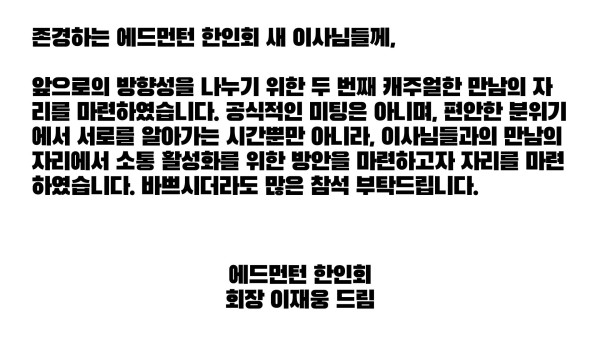 새롭게 선출된 한인회 이사 두번째 모임 및 워크샵 작성자 정보 운영자 작성 작성일 2026.04.11 22:45 컨텐츠 정보 18 조회 목록 본문 SNS 공유 관련자료 링크 http://www.edmontonkorean.org/notification/%ec%83%88%eb%a1%ad%ea%b2%8c-%ec%84%a0%ec%b6%9c%eb%90%9c-%ed%95%9c%ec%9d%b8%ed%9a%8c-%ec%9d%b4%ec%82%ac-%eb%91%90%eb%b2%88%ec%a7%b8-%eb%aa%a8%ec%9e%84-%eb%b0%8f-%ec%9b%8c%ed%81%ac%ec%83%b5/ 8 회 연결 댓글 0 등록된 댓글이 없습니다. 로그인한 회원만 댓글 등록이 가능합니다. 목록