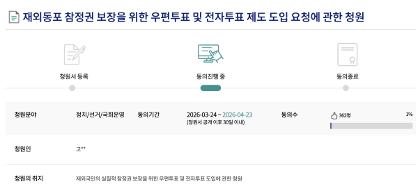 재외국민 참정권 보장 위한 국회 국민동의청원 진행… “우편·전자투표 도입 시급”