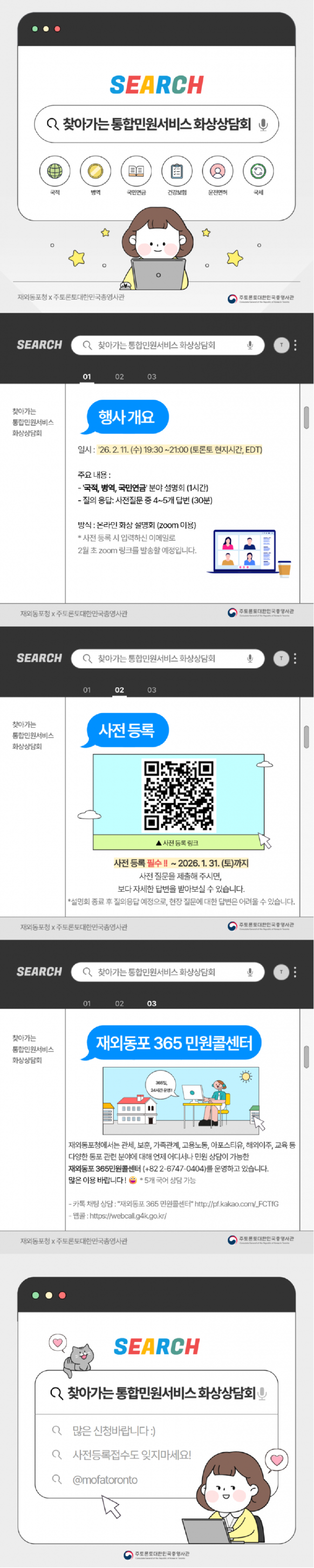 주토론토총영사관과 재외동포청 주관으로 **「통합민원서비스 온라인 화상상담회」**가 아래와 같이 개최될 예정이오니, 관심 있는 교민 여러분의 많은 참여를 바랍니다.