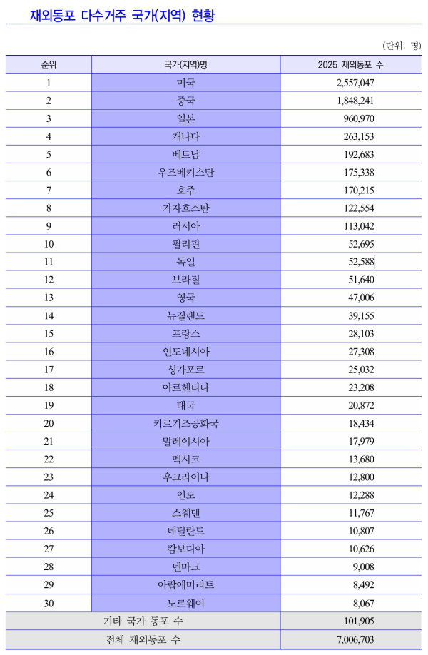 재외동포청은 12월 31일 **‘2025 재외동포현황’**을 발표하며, 전 세계 재외동포 수가 700만 6천 명으로 집계되었다고 밝혔습니다. 이번 통계는 재외공관 자료와 해외 동포단체 정보를 종합해 산출한 추정치입니다.